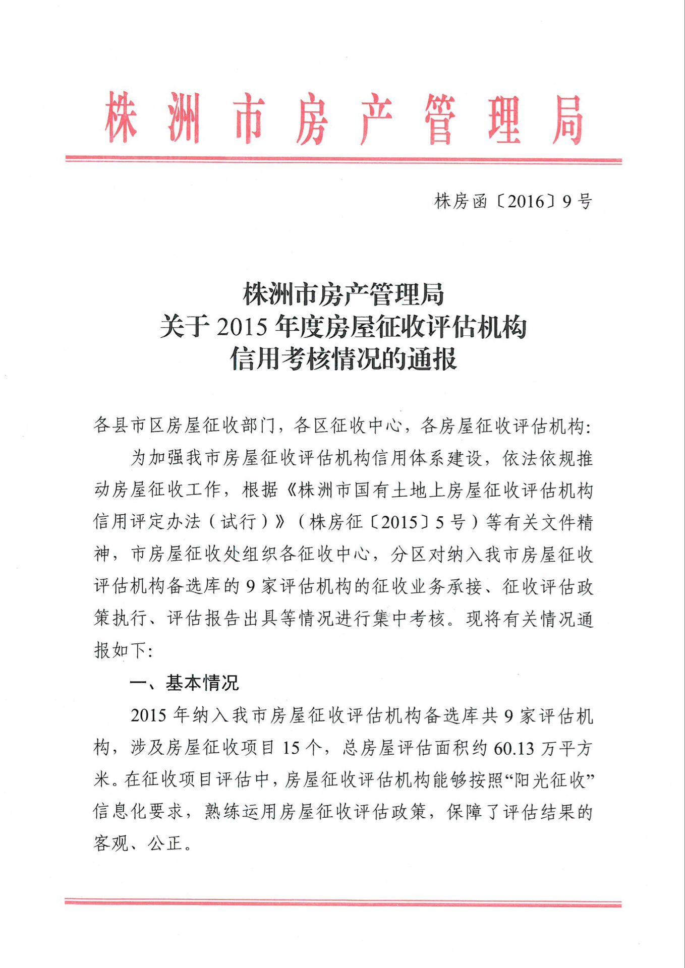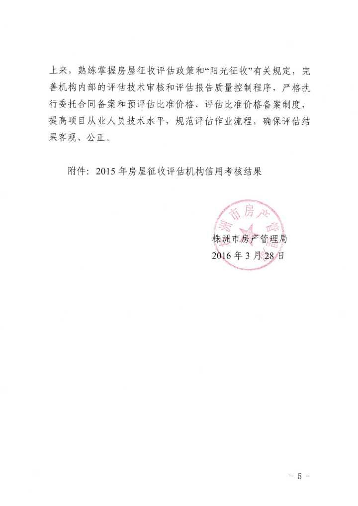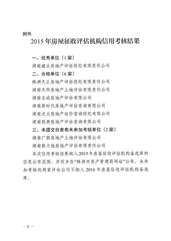 株洲市房產(chǎn)管理局關(guān)于2015年度房屋征收評(píng)估機(jī)構(gòu)信用考核情況的通報(bào)